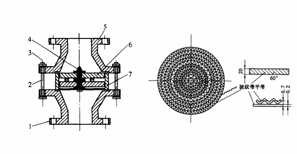 不锈钢阻火器由阻火芯件(不锈钢波纹阻火板)和壳体两部份组成,芯件是核心,是由两层超薄的不锈钢带,一条被压成波N形,另一条平面钢带则将它围绕圆心紧紧缠绕而成。从而构成无数个端面,是小三角形直通流道,而且在芯件内部有一个十字结构的支架(或在表面压上丫形架)借以增强芯件的牢靠性,避免芯件被点燃的介质所产生的爆炸压力冲散。介质从三角形狭道中通过,阻火器也正是通过它来阻止火焰在管道中的蔓延,其原理为“器壁效应",就是火焰与器壁的碰撞进行能量转换,降低了温度。以此原理来设计三角形孔的高度阻止火焰的通过,再加上足够的流道长度来吸收火焰的热量,使其在芯件中熄灭,避免了气体在芯件的另一端被复燃的可能性。